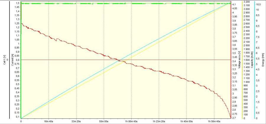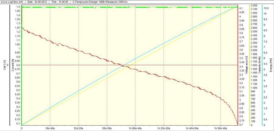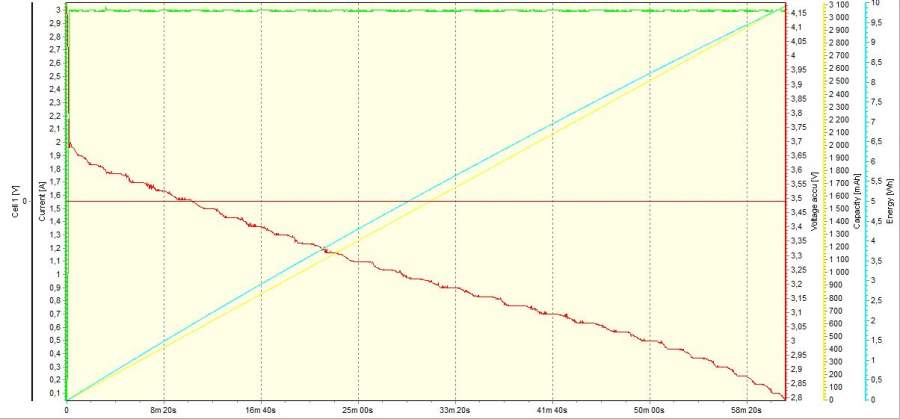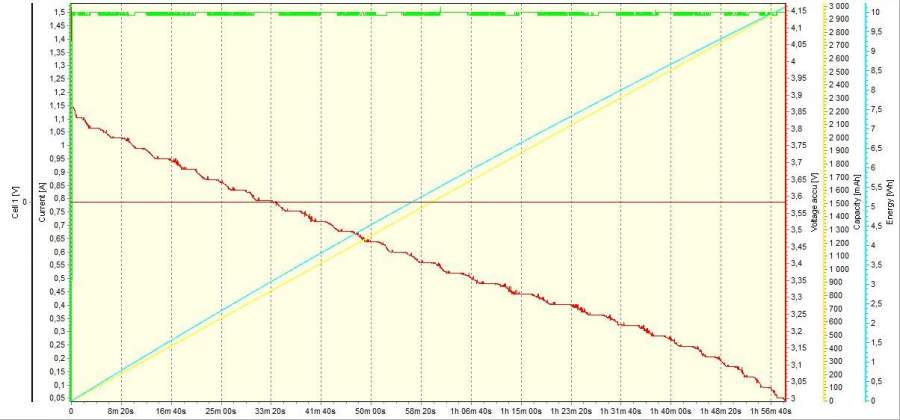 Длина - 65 мм Диаметр - 18 мм Вес - 46 гр У аккумулятора утопленный положительный вывод, что создает трудности при установке в зарядное устройство. Для хорошего контакта требуется магнитик. Оборудование: Заряднодиагностическое устройство iCharger 106B. Зарядное устройство XTAR WP2II Методика испытаний Испытания проводились на 2-х образцах одной партии. Испытани проводились при комнатной температуре. Испытания образца №1 Режим заряда (iCharger 106B) Ток, А - 1,0 Напряжение конечное, В - 4,2 Ток окончания заряда, А - 0,1 I Цикл: Разряд Ток, А - 1,5 А Напряжение конечное, В - 3,0 Емкость, Ач - 3000 II Цикл: Разряд Ток, А - 1,5 А Напряжение конечное, В - 2,7 Емкость, Ач - 3200 III Цикл: Разряд Ток, А - 1,5 А Напряжение конечное, В - 2,7 Емкость, Ач - 3200 IV Цикл: Разряд Ток, А - 3,0 А Напряжение конечное, В - 2,7 Емкость, Ач - 3100 V Цикл: Разряд Ток, А - 3,0 А Напряжение конечное, В - 2,8 Емкость, Ач - 3100 Испытания образца №2 Режим заряда (XTAR WP2II) Ток, А - 1,0 Напряжение конечное, В - 4,2 Ток окончания заряда, А - ~ 0,07 I Цикл: Разряд Ток, А - 1,5 А Напряжение конечное, В - 2,7 Емкость, Ач - 3300 II Цикл: Разряд Ток, А - 1,5 А Напряжение конечное, В - 2,7 Емкость, Ач - 3200 [Исправлено: Labour, 24.06.2012 в 22:45] |