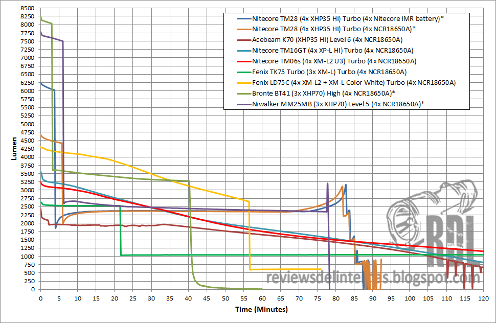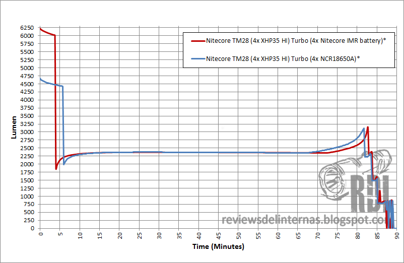 (All measurements are taken following the ANSI NEMA FL1 procedure, taking as value the highest point of the reading between the second 30 and 120 after activation. More details here.) Again, this is a flashlight that exceeds the range of measurement for which the sphere was conceived, so the value for the highest mode of all is a mere approximation after comparing the ceiling bounce of the same with that of the Other accurate measurements. The delivery of the modes is very good, covering very well the wide range between the 2 of the ultra-low and the 6000 of the turbo. The agreement between the measured and the specified is excellent, with all the modes that I have been able to measure accurately having slightly more output than their specs. The estimations made after comparing the ceiling bounce values between the modes that I have not been able to measure within the sphere also follow that tendency. PERFORMANCE As mentioned before, the TM28 will work differently depending on the type of batteries we use. ![]() We can see the difference between the test performed with the IMR batteries versus the Li-Ion batteries with which I routinely perform my runtime tests. The IMR is able to deliver much more initial power, far surpassing the 6000lm barrier at activation and staying above until the stepdown goes into action and goes into High mode. ![]() This stepdown is controlled by temperature, and as you can read in the instruction manual, when reaching 60ºc, the TM28 will lower a mode to prevent damage from overheating. By carefully looking at the difference between the two types of batteries, the TM28 with the Li-Ion and its lower performance is able to stay in the Turbo mode for a few extra minutes compared to what it is able to do with the IMR thanks to the lower temperature generated. ![]() Compared with other multi-LED flashlights the TM28 offers one of the best regulations, with a good balance between maximum performance and runtime thanks to its stepdown management. EFFICIENCY (More details on how this calculation was done here.) After calculating the efficiency of this TM28 in its maximum performance mode, we see that thanks to the lower initial output and stepdown management is able to achieve with li-ion battery setup, one of the best combined values of what we have seen so far. However, the stepdown from 6000lm kills the value up to 50%. BEAM PROFILE The four XHP35 HI emitters, being implemented independently of each other, create a surprisingly clean projection without that typical overlapping effect that other multi-emitters with “shared” deflectors have. ![]() ![]() ![]() ![]() The enormous amount of light emitted by the XHP35 HI makes it difficult to notice the profile of this Tiny Monster, and we will have to go to the faster shooting speeds to intuit as the TM28 projects its light onto a smooth surface. ![]() The tint is, in my modest opinion, one of the best cool white I’ve seen in a flashlight of these features, free of any visible dominant color. ![]() ![]() ![]() ![]() Although the XHP35 HI is a LED emitter conceived to provide extreme throw, given the dimensions of the independent reflectors, the TM28’s projection is somewhat more balanced than a single-emitter thrower would offer. PERSONAL CONCLUSION Although big high-performance flashlights are not my favorite, I have to admit that with material like the one I’ve recently treated, it is easy to catch the taste of this kilo-lumen monsters… This new proposal from Nitecore has proved to be a very well-balanced flashlight, with a very complete user interface and spectacular performance. ![]() Niwalker MM25MB · Nitecore TM28 · Fenix LD75c · Nitecore TM16GT Negative aspects: The charging port, although very useful, forces us to take with us the “proprietary” power adapter. In my opinion, Nitecore should have updated the design of the TM28 (mechanical and electronic) so, like other flashlights of the brand, makes use of a widely extended microUSB port. Positive aspects: Although it does not reach the level of the Niwalker MM25MB, the TM28 is still a relatively compact flashlight, which at hand feels very balanced. The user interface, as usual in Nitecore products, is complete, simple to memorize and rich in functions and features. I find it very interesting to have “separated” the two highest modes into a different group. The amount of information available on display is really a delight for those who enjoy this kind of details. Special mention to the elegant way Nitecore solves the eternal problem of compatibility with button-flat-protected-unprotected batteries. Nitecore TM28 sample provided by Nitecore for analysis, test and review. Thank you! |