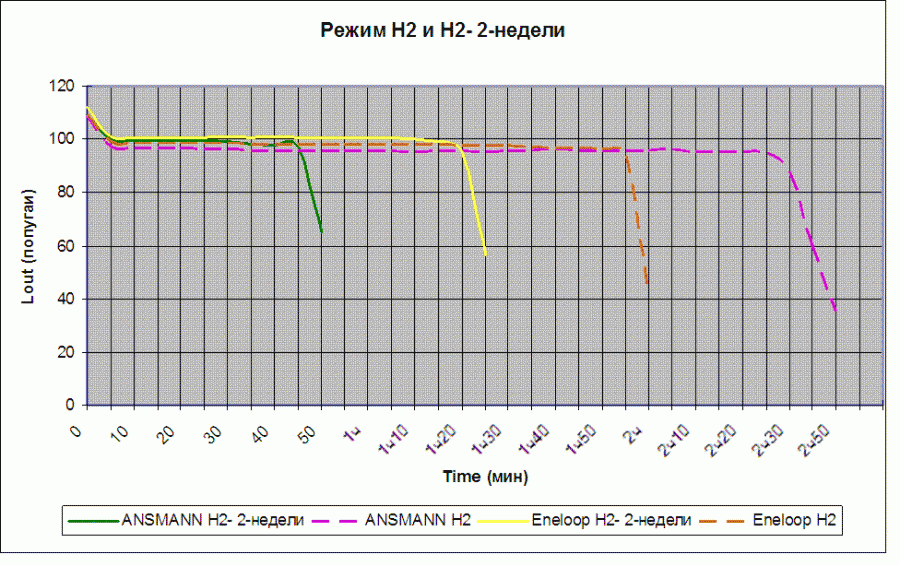Добрый вечер.Прошло ровно две недели как я положил на полку Eneloop и ANSMANN. Пора посмотреть что получилось. И так: режим Н2 для того, чтобы было виднее :Lanyard2: