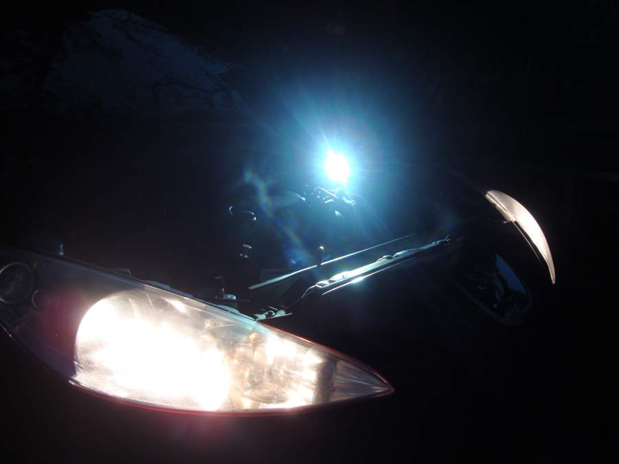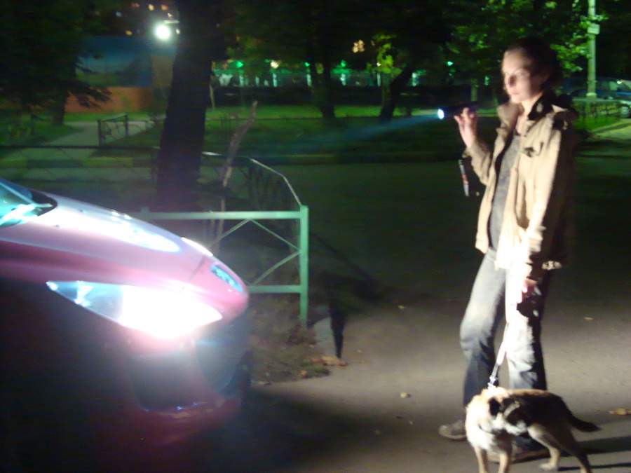 Своей машины у меня нет, так что пришлось слегка поднапрячь друзей с Reno Megane 3. Выкатили машину, направили свет в нужную точку и приступили к опытам. Во всех кадрах использовались следующие параметры: ISO 200, выдержка 4 секунды, диафрагма 4.5. Коррекция фотографий не выполнялась, хотя они были слегка сжаты для уменьшения объема файлов. Фокусное расстояние эквивалентно 28 мм для 35-миллиметровой пленки. Камера Canon EOS 350 D, автомобиль Reno Megane 3, фонари Thrunite Scorpion на XM-L T4 (теплый свет), EagleTac M3C4 на диоде SST-50 (нейтральный свет), Fenix TK45 на трех XP-G R5 (холодный свет). Все фонари - в режиме "турбо". Контрольный снимок (без подсветки): Reno Megane 3 - ближний свет: Reno Megane 3 - дальний свет: Scorpion: M3C4: TK45: Трудно удержаться от выводов, поэтому просто попытаюсь быть кратким. Фонари показали себя на удивление достойно, хотя условия были заведомо неравными: свет фар сконцентрирован совершенно иначе - они практически не светят вверх, а если листья на переднем плане выглядят подсвеченными - то это, надо полагать, эффект отражения света от светлого асфальта. При этом боковая засветка у фар, на мой взгляд, несколько избыточна, но, возможно, водителям так удобнее - чтобы темные пятна по бокам не сильно контрастировали с ярким пятном посередине. В общем, асфальт прямо под колесами машина безусловно освещает лучше, вдоль дороги тоже светит неплохо, а вот равномерности, которую я так ценю в фонарях, тут явно недостает. Лично я не особо был бы доволен фонарем с таким распределением света. Кроме того, следует учесть, что фар все-таки две, а фонарик один. Для полноты картины следовало бы провести видеосравнение на ходу, но слишком сильно напрягать друзей я не посмел. Ладно, оставим это для какого-нибудь следующего раза.