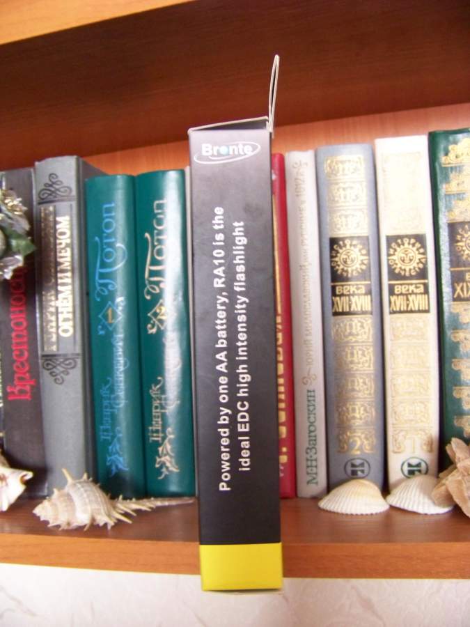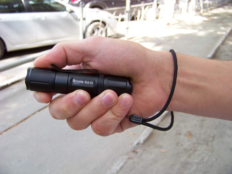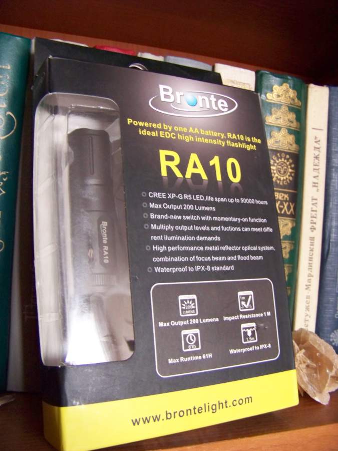 Вступление. Для меня фонарик Bronte оказался довольно привлекательным. До этого я держал у себя в руках либо очень мощные фонари, либо слегка улыбался держа в руках подобия фонарные. Цель. 1. Я расскажу о характеристиках светодиодного фонаря Bronte RA 10 и опишу их 2. Я поделюсь своими впечатлениями от использования светодиодного фонаря Bronte RA10 3. Небольшое сравнение по свету с другими подобными фонарями 1.Характеристики светодиодного фонаря Bronte RA 10: • Габаритные размеры: 100мм * 23мм * 23мм • Вес (без элемента питания): 64г • Источник света (светодиод): 1 LED cветодиод - Cree XP-G R5 • Максимальный световой поток: 200 Люмен • Фокусировка луча: нет • Входное напряжение: 0.8V-4.2V Max • Ток светодиода: 750 mA • Цифровая стабилизация тока: есть • Материал рефлектора: алюминий Т6 • Поверхность рефлектора: гладкое • Материал линзы: закаленное стекло • Покрытие корпуса: анодированное, стойкое к царапинам • Количество режимов работы: 4 (Максимальный: 200 люмен, 1час > Средний: 100 люмен, 3 часа > Низкий: 20 люмен, 61 час > Строб: 200 люмен) • Элементы питания: 1 x АA никель металогидридный аккумулятор/батарейка / 14450 литиевый аккумулятор • Время работы (Мах): 61 час (режим: Низкий) • Комплектация: подарочная упаковка, чехол, запасные уплотнительные кольца, шнурок с карабином для переноски на запястье руки [/SIZE] 2.Личные впечатления от использования светодиодного фонаря Bronte RA10 Упаковка Упаковка выглядит ярко с вырезом с левой стороны для возможности увидеть фонарик находящегося в нём, что помогает при продаже- необязательно всегда доставать фонарик из упаковки, а стало быть, уменьшается износ и презентационный вид упаковки сохраняется длительнее. Вынесенный язычок вверху упаковки позволяет удобно закрепить фонарик в упаковке вертикально на любом оборудовании с зацепом – что позволяет создавать навесной блок ТМ Bronte – что соответственно увеличит продажи данной ТМ. Также упаковку легко устанавливать горизонтально и вертикально. На упаковку вынесены основные характеристики фонарика. Длительность работы, максимальная мощность, влагозащита. Ниже рисунками указаны допустимые катаклизмы : выдерживает падение с 1 метра, влагоустойчив при погружении до 1,5 метра, максимальное заявленное время свечения 61 час , мощность свечения 200 люмен. Внизу упаковки на желтом фоне сайт компании производителя, что крайне удобно, если вдруг возникнут какие ни будь сложности в использовании – можно задать вопрос производителю, что говорит об открытости производителя и готовность его идти на контакт с обладателем фонарика. С обратной стороны упаковки указаны возможные элементы питания. Краткая характеристика и контактные телефоны. Внутри в пластиковой упаковке закреплены от возможных ударов фонарик, шнурок для фонарика на руку, два запасных уплотнительных кольца и запасная резиновая кнопка переключателя в полиэтиленовом пакете, чехол Bronte и руководство / гарантийный талон. Обзор фонарика снаружи. Особенности дизайна. Bronte RA10 использует 1 аккумулятор или батарейку типа АА или литиевый аккумулятор типа 14500от (в комплекте поставки они не входит). Размещается батарейка продольно минусом к кнопке переключателя , а плюсом к диоду и отражателю не портя классическую узнаваемую форму фонарика. Резьбы смазаны, резинки на месте и уплотняют. Клипса- крепление выступает из цилиндрической формы фонарика, но она мо
