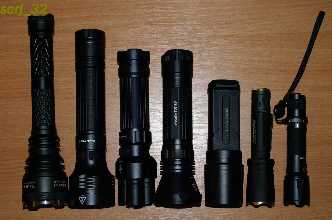 Это самый старый из мощных фонарей фирмы Феникс. Но тем не менее фонарь довольно живой, и держится на равных с другими моделями. Раскручиваем Резьба прямоугольного профиля, по корпусу фонаря проходят управляющие сигналы от электронной кнопки Диод в фонаре установлен немножко криво, но на форму луча это никак не влияет В последних моделях в кассете в качестве проводников используется металлический(медный) стержень, в этой кассете используется провод Так же в некоторых моделях фонаря была возможность питать его от 4хАА. В моем экземпляре я не смог найти такой комбинации. Плюсы - - Надежность проверенная многими покупателями, уже было много краш тестов фонаря - одна из самых широких боковых засветок, при хорошо сфокусированном луче. Минусы - -Нет чехла в комплекте -не самый современный диод -питание аж 8хАА TK45 "Змей Горыныч" Упаковка идентична ТК40 Тело используется только как контейнер для батарей. Корпус можно переворачивать как угодно (на моих фото это вроде показано) В разобранном виде Головы фонаря ввинчены в корпус и заклеены Кассеты для батарей тк40 и 45 почти идентичны, вот только у тк45 нету проводника в центре кассеты, как у тк40 Плюсы - - широкий центральный луч, который обеспечивает заливной свет - хорошие слабые режимы (работает только 1 диод) - хорошо продуманный темляк Минусы - - Нет чехла в комплекте - необычный вид (может и плюс) - питание аж 8хАА - в одном рефлекторе есть черная пылинка TK50 Пожалуй самый необычный фонарь, даже не из той весовой категории, что другие, так как в нем установлен диод R5. У фонаря очень хорошая фокусировка!!! Упаковка - стандартная коробочка У фонарей что поставляются в коробочке есть одна недокументрованная функция А еще в коробочке фонарь можно хранить и транспортровать, пластик не хрупкий, как у коробки для НР20. Фонарь разбирается В хвосте хорошая пружина, а в голове медный контакт тоже подпружинен. Можно перевернуть тушку в другую сторону, но фонарь не будет работать (видно витки резьбы не позволяют сделать хороший контакт через корпус). Резьба прямоугольная, смазанная Рефлектор глубокий На стекле видно фиолетовое просветление, пыли в рефлеткоре нету, диод стоит четко по центру. Постараюсь написать про этот фонарь отдельный обзор. Боковая засветка очень неплоха в комнате. ТК15, Predator, TK50 А еще это фонарь можно кормить АА батареками: есть переходник Д-1(2)хАА. Плюсы - - есть что-то в фонаре классическое от маглайта, неплохой корпус - отличная фокусировка и дальнобойность - довольно широкая боковая засветка, чтобы использовать вблизи - длительное время работы Минусы - - сильный фокус осложняет использование на близких дистанциях - Нет чехла в комплекте - слабый режим не выглядит слабым - непродуманный темляк Catapult V2 Упаковка невзрачная, но внутренняя организация коробки показывает, что не все так просто Все упаковано в отдельные кулечки, ничего не болтается. Огорчает отсутсвие чехла, но это уже зависит от продавца: положит он чехол в комплект, или продаст отдельно. Разбирается все! Рефлектор также можно докупить мятый, но с гладким, вроде, лучше дальнобойность Резьба трапециевидного профиля. Смазка есть, но она нанесена неравномерно. Плата драйвера заказная, а не ширпотреб. На плате в виде печатной дорожки видно название марки. Светодиод стоит мощный, но его свет с некой синевой Плюсы - - мощный - хорошо сфокуси