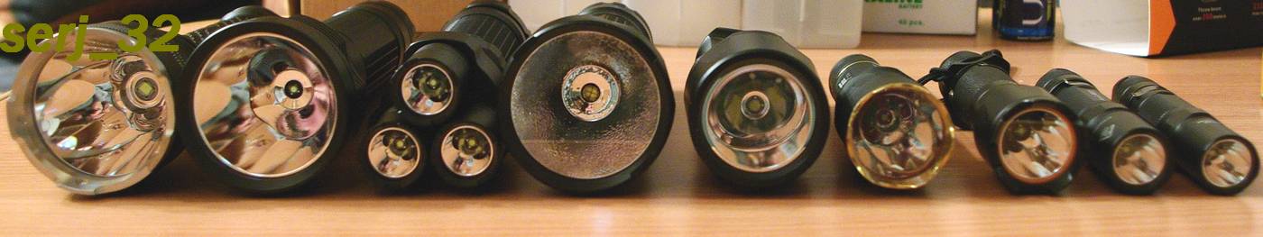 Это самый старый из мощных фонарей фирмы Феникс. Но тем не менее фонарь довольно живой, и держится на равных с другими моделями. Раскручиваем Резьба прямоугольного профиля, по корпусу фонаря проходят управляющие сигналы от электронной кнопки Диод в фонаре установлен немножко криво, но на форму луча это никак не влияет В последних моделях в кассете в качестве проводников используется металлический(медный) стержень, в этой кассете используется провод Так же в некоторых моделях фонаря была возможность питать его от 4хАА. В моем экземпляре я не смог найти такой комбинации. Плюсы - - Надежность проверенная многими покупателями, уже было много краш тестов фонаря - одна из самых широких боковых засветок, при хорошо сфокусированном луче. Минусы - -Нет чехла в комплекте -не самый современный диод -питание аж 8хАА TK45 "Змей Горыныч" Упаковка идентична ТК40 Тело используется только как контейнер для батарей. Корпус можно переворачивать как угодно (на моих фото это вроде показано) В разобранном виде Головы фонаря ввинчены в корпус и заклеены Кассеты для батарей тк40 и 45 почти идентичны, вот только у тк45 нету проводника в центре кассеты, как у тк40 Плюсы - - широкий центральный луч, который обеспечивает заливной свет - хорошие слабые режимы (работает только 1 диод) - хорошо продуманный темляк Минусы - - Нет чехла в комплекте - необычный вид (может и плюс) - питание аж 8хАА - в одном рефлекторе есть черная пылинка TK50 Пожалуй самый необычный фонарь, даже не из той весовой категории, что другие, так как в нем установлен диод R5. У фонаря очень хорошая фокусировка!!! Упаковка - стандартная коробочка У фонарей что поставляются в коробочке есть одна недокументрованная функция А еще в коробочке фонарь можно хранить и транспортровать, пластик не хрупкий, как у коробки для НР20. Фонарь разбирается В хвосте хорошая пружина, а в голове медный контакт тоже подпружинен. Можно перевернуть тушку в другую сторону, но фонарь не будет работать (видно витки резьбы не позволяют сделать хороший контакт через корпус). Резьба прямоугольная, смазанная Рефлектор глубокий На стекле видно фиолетовое просветление, пыли в рефлеткоре нету, диод стоит четко по центру. Постараюсь написать про этот фонарь отдельный обзор. Боковая засветка очень неплоха в комнате. ТК15, Predator, TK50 А еще это фонарь можно кормить АА батареками: есть переходник Д-1(2)хАА. Плюсы - - есть что-то в фонаре классическое от маглайта, неплохой корпус - отличная фокусировка и дальнобойность - довольно широкая боковая засветка, чтобы использовать вблизи - длительное время работы Минусы - - сильный фокус осложняет использование на близких дистанциях - Нет чехла в комплекте - слабый режим не выглядит слабым - непродуманный темляк Catapult V2 Упаковка невзрачная, но внутренняя организация коробки показывает, что не все так просто Все упаковано в отдельные кулечки, ничего не болтается. Огорчает отсутсвие чехла, но это уже зависит от продавца: положит он чехол в комплект, или продаст отдельно. Разбирается все! Рефлектор также можно докупить мятый, но с гладким, вроде, лучше дальнобойность Резьба трапециевидного профиля. Смазка есть, но она нанесена неравномерно. Плата драйвера заказная, а не ширпотреб. На плате в виде печатной дорожки видно название марки. Светодиод стоит мощный, но его свет с некой синевой Плюсы - - мощный - хорошо сфокуси