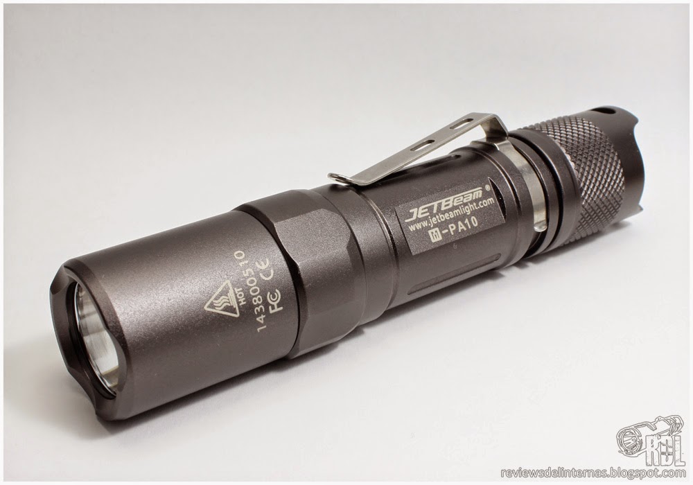 ![]() JETBEAM M-PA10 LED: CREE XM-L2 T6 CW Battery: 1x AA, 1× 14500 Modes: 6 (Turbo-High-Medium-Low-Strobe-SOS) Switch: Forward in the tailcap, twisty. Date: January 2015 INTRODUCTION: JETBEAM launches the new M-PA10, a new flashlight into the “performance” line of legendary Asian manufacturer. It is a multipurpose flashlight medium-large sized compatible with primary or rechargeable AA batteries (NiMH, NiCd) and Li-Ion batteries (14500), promising high output for this type of multi chemical lights. ![]() The product presentation, thankfully, abandons the idea of blister and returns to the classic cardboard box, much more comfortable and practical. ![]() Inside along the flashlight,we have a paracord wrist strap, a set of spare o-rings and switch coating, and the usual documentation in which we find the warranty card and user manual. JETBEAM again dispenses a holster between the included accessories. EXTERIOR FINISH: I don’t lie when I say that my first impression when removing the flashlight from the box, my thought was that it was an error and I was getting another model instead because due dimensions of the flashlight is easy to think that this is a compact 1× 18650 / 2x CR123A . But nope. ![]() ![]() It is a robust oversized flashlight, wherein the wall thickness of the aluminum pieces that compose is imposing. With a weight of 83 grams (excl. battery), 120mm long and 25mm in diameter, we are surely facing one of the largest AA flashlights on the market. ![]() The exterior finish stands out for its dark gray anodized, very nice and uniform over all parts. Logos in white laser etched on different parts, all perfectly defined and readable by the high contrast to the background. The head of the flashlight features a smooth bezel, slightly crenelated. In the neck there is a machining in which there are a number of flat spots that keep the flashlight from rolling when placed on a flat surface. ![]() The optics of this M-PA10 is composed of a glass lens with AR treatment, a smooth reflector and a decently centered XM-L2. Inside we find the driver, with a mechanical against reverse polarity in the form of a ring surrounding the positive pole contact, which can cause some problems when using a 14500 with positive top not too sharpened. ![]() The threads have a trapezoidal cut, raw aluminum for the head and anodized in the tailcap. Come clean although no traces of grease. ![]() The tube features a clip which is clamped by pressure, and can be installed only in one direction. Clip tension is medium-low, and appears to clamp only 50% of the diameter of the track, so can easily “pop off”. The tube walls have 4mm aluminum, a considerable thickness. The tailcap has the flashlight only knurled area, so it is easy (even with dry threads) unscrew the cap to replace the battery. The forward switch has a good feel, similar to the typical Nitecore forward switches, in which momentary activation is approximately 40% travel to click. ![]() Two battlements surround the button, both perforated to provide an anchor point to the strap. Unfortunately, the button profile protrudes a few tenths of a millimeter on these battlements, so that the flashlight may be placed in tailstand, albeit unstable. USER INTERFACE: The user interface of the M-PA10 is similar, identical, to that we saw in the Nitecore Multi-Task range. The flashlight has two main modes, with the Turbo as common mode and the second configurable. ![]()