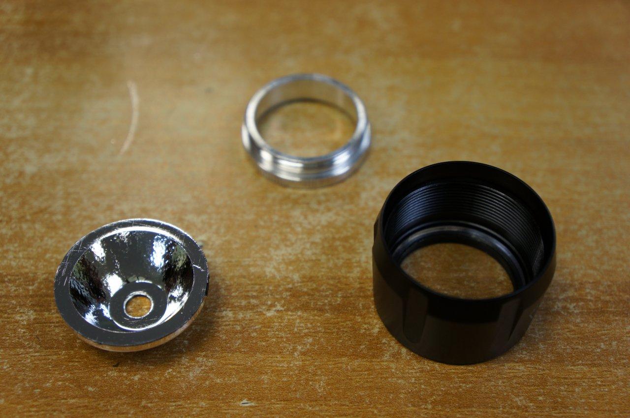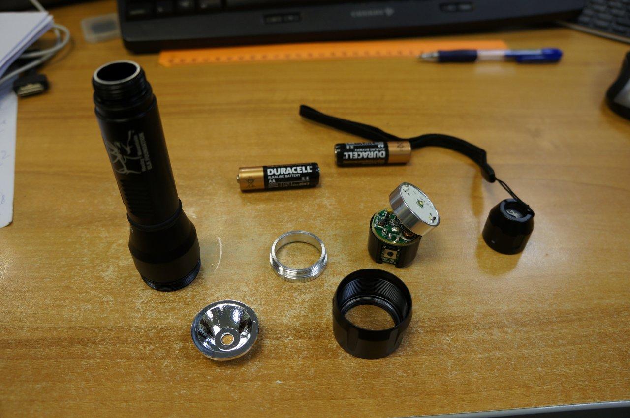 Фонарь в руке лежит отлично, собран качественно, единственное центровка отражателя не идеальна, так как отражатель пластиковый и немного болтается. Сборка драйвер-диод закреплена отдельным кольцом, по словам производителя может использоваться как подствольник. Отражатель с апельсиновой коркой, но при этом свет хорошо сфокусирован в центре с неяркой боковой засветкой. Получился такой маленький дальнобойник. Помимо деревянной декоративной вставки на корпусе присутствуют две отфрезерованые насечки которые очень удобно ложатся под палец и способствуют фиксации фонаря в руке, а также видимо служат для крепления фонаря под стволом в спец креплении. также есть резиновое кольцо скрывающее соединение деталей корпуса. Алюминий на корпусе очень толстый, фонарь увесист. Резьбы крупные и анодированые, резинки на месте, фонарь герметичен. А вот в разобранном виде, при желании возможна модернизация Как видно диод отцентрован хорошо, а вот отражатель немного болтается внутри головы, но можно поймать нужное положение при сборке. Серебристое кольцо крепит сборку драйвер-диод к корпусу, нагрузки на стекло нет. Диод на необычно большой дюймовой звезде Драйвер спаян аккуратно, на обратной стороне плюсовой контакт а пластмассовый корпус служит еще и защитой от обратной полярности, батарейка входит внутрь пластмаски. Кнопка сидит на отдельной плате, припаяной к драйверу Пружина с контактом приклепана к тэилкапу очень крепко, кончик загнут, батарейку не царапает, шнурок в комплекте, но мешает стоять на хвосте. Характеристики от производителя: All-aluminum construction with walnut handle inlays Latest generation Cree® XPE LED is rated for 50,000 hours use High-low electronic switch with lock-out O-ring sealed for water-resistance Includes lanyard and two AA batteries Length - 5.25" Brightness: 145 lumens Effective distance: 150 meters