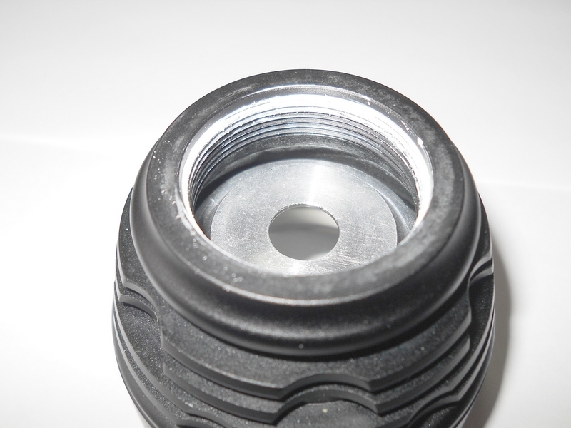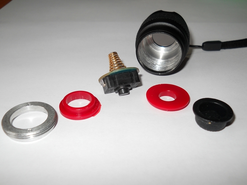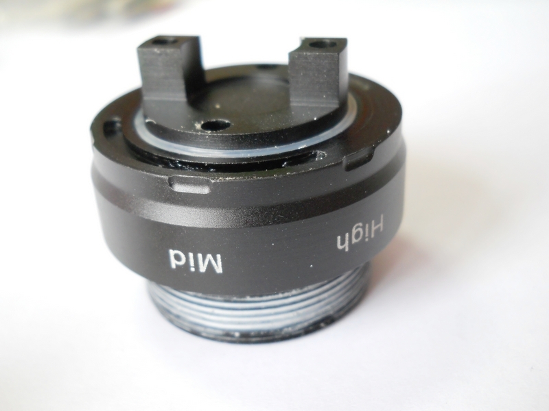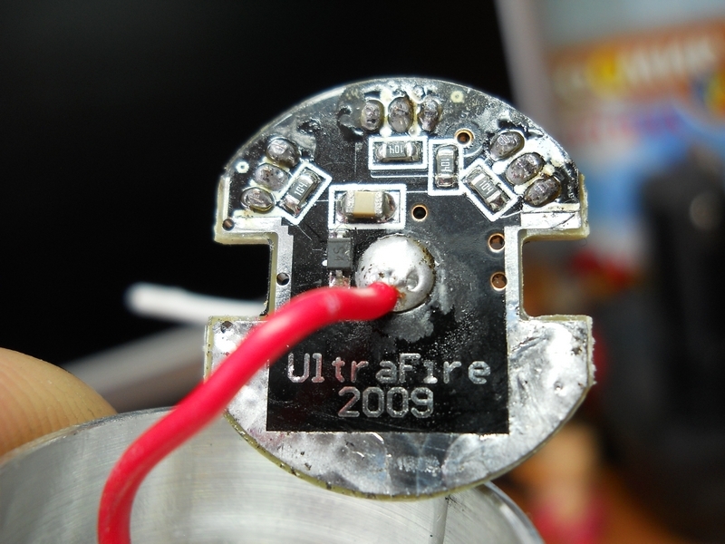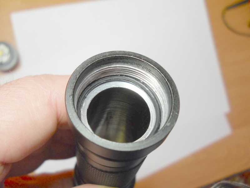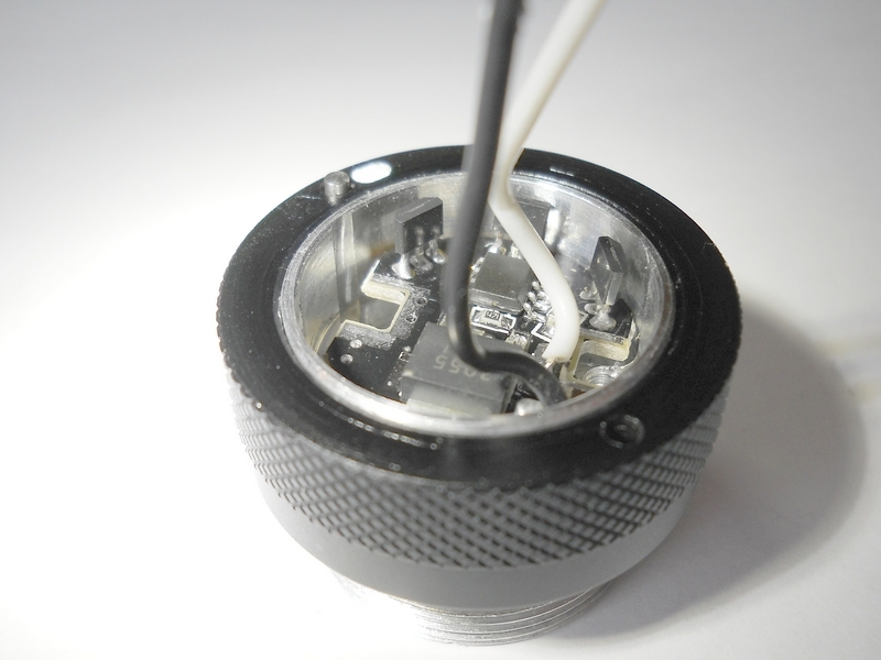 Замеряем ток. От аккумулятора фонарь тянет 1,22А; 0,38А; 0,13А в соответствующих режимах, при этом амперметр показывает ток через диод 1,19А; 0,36А; 0,12А. Замерял, включая прибор последовательно. Точность прибора и влияние проводов щупов мне неизвестны. Для примерной оценки могу дать показания этого же прибора при работе трипла LuxRC модификации L333-SM-XPGGC2-C Fully-Regulated Single-Mode Engine. Outdoor White 4500K. 3UP CREE XP-G R4 4C. 750mA. 130Lm/W. OD 20mm. DC 2.8V-9.9V : В момент пуска 2,5А, через 10-15 секунд снижается до 2,2А и стабилизируется. При работе фонарь нагревается и остывает медленно - сказывается большое количество металла, в том числе и непосредственно под диодом. Этакий тепловой аккумулятор. Что там внутри: Кнопка и её корпус. Резьба не очень высокого качества, как говорят, «неполная». Откручиваем голову - на резьбе остатки термопасты. Напоминает слегка засохшую зубную пасту. В основании резьбы на батарейном блоке - уплотнительное кольцо. Сама голова довольно солидна: 3-4мм-й алюминий и вес 100гр. Солидный запас теплоёмкости. Диод установлен ровно, приклеен термоклеем . По краям от установочного места имеются глухие отверстия, глубиной 10-15мм*, на дне - головки винтов, соединяющие эту часть коммутационного блока с другой, которая является держателем драйвера и контактной площадки.