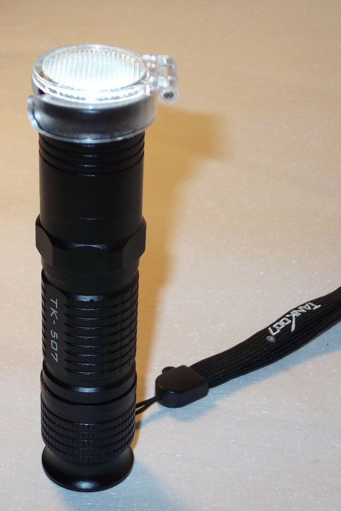 TANK007 TK507 1*AA or 1*14500(Li-ion) Cree XP-G R5 LED flashlight Случайно мне достался такой фонарь и по приезду сразу перекочевал в сумку супруги. Родился новый флешаголик... Ну или почти сразу, после небольшого обзора. Замечу, что характеристики отличаются в лучшую сторону от заявленных на официальной торговой площадки производителя: Tank007 http://www.tank007.com/ Почему? Специальный заказ ограниченной партии для магазина http://fonari.in****/ являющегося официальным представителем Tank007 в Украине собственно откуда и был получен фонарик, диффузор и аккумулятор 14500 в подарок. Фонарь приехал в подарочной упаковке Решено было снять видеовскрытие <object height="344" width="425"> <embed src="http://www.youtube.com/v/i7d8Ym3SyLQ?hl=ru&fs=1" type="application/x-shockwave-flash" allowscriptaccess="always" allowfullscreen="true" height="344" width="425"></object> Испытания устраивать некогда, но обмыть фонарик не помешает. Продолжим с фотографиями внешнего вида, т.к. часто не хватает именно этой информации: Никаких неприятных сюрпризов не заметно. Корпус выполнен качественно и как всегда со вкусом, анодирование на месте. Посмотрим что же там внутри или из чего состоит фонарик: В целом всё как обычно - голова, тушка, тейлкап. Посмотрим поближе на тушку: Однако неплохо, внушает доверие такая конструкция и толщина. Резьба прямоугольная с большим шагом. Всё смазано, везде резинки. Можно большое количество раз менять батарейки и не переживать, что что-то сотрётся об этом ниже... Продолжим осмотр пациента. Тэйлкап и кнопка: Хочется отметить несколько моментов. Фонарик уверенно стоит на хвосте. Шнурок продевается правильно как и должно быть и не мешает фонарику выполнять роль свечи. Резинка стандартная 14мм. Кнопка немного тугая тактильно, но это не мешает комфортно переключать режимы, кратковременным размыканием цепи. Голова: Голову не получилось открутить сразу, но она в общем-то поддалась чуть позже. Диод как видим по центру. Рефлектор на резьбе вкручен, но имеются отверстия что-бы его оттуда извлечь. Между рефлектором и стеклом есть резинка для герметизации фонарика. Диаметр подложки светодиода 16мм. Пружинка плюсового контакта отсутствует это правильное решение, т.к. можно открутить кнопку слегка и спокойно транспортировать. Фонарь гарантированно не включится! Перейдём к фото где показаны реальные размеры, с размерами производителя совпадают: Режимы фонарика переключаются циклически и фонарь имеет 5 режимов с памятью - Сильный - Средний - Слабый - Строб - Сос При кратковременном размыкании цепи происходит переключение, можно размыкать не только кнопкой, но и коротким откручиванием фонаря и спокойно бросать в карман с ключами. Время работы тестировалось на 8 батарейках AA, собственно не было света, в том числе и сильно б/у, как раз вспомнить и сказать спасибо за хорошую резьбу... Лучший результат: фонарь проработал чуть более часа в максимальном режиме, после чего идёт очень заметное падение яркости и фонарём так ещё можно светить минут 10-15 не более. Как только началось падение яркости, фонарик лучше не выключать т.к. больше он не включится. Старт с максимального режима, достаточно разомкнуть цепь на 10секунд. Вечером с TK507 комфортно: есть возможность переключится на слабый режим и не слепить себя и окружающих, но а в максимальном 30метров уверенная дальность и ослабленная боковая засветка. То что надо! Спектр света ~ 5500 не более не синит, может совсем немного с желтизной. Следующий снимок 