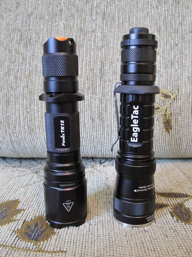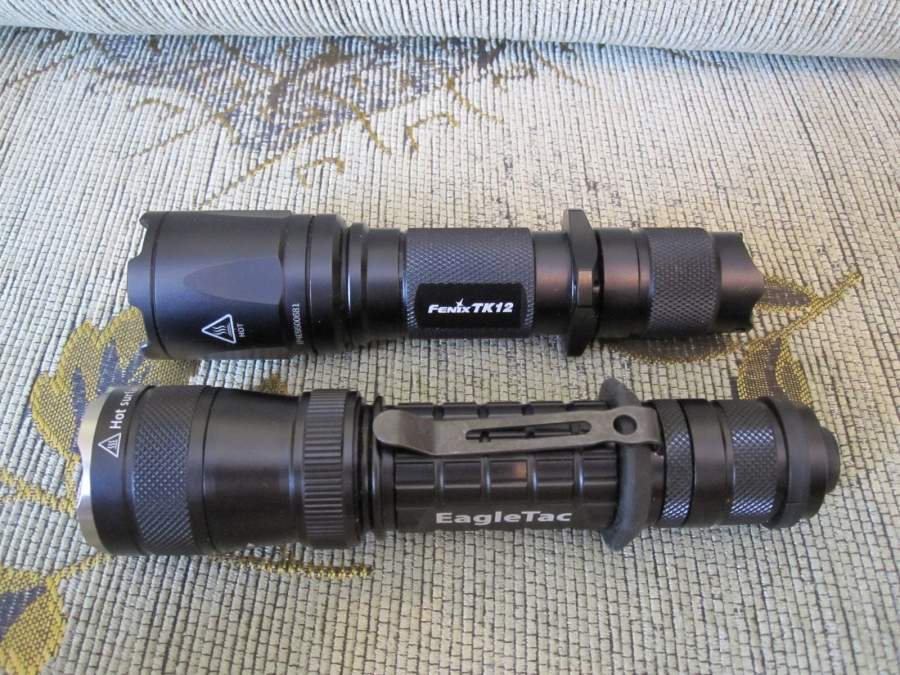 Вместо предисловия Несколько дней назад, мною был написан и размещен обзор на данный фонарь. Было сделано много фоток, рассмотрены некоторые особенности фонаря, но из-за магнитной бури плохого настроения этот обзор был безжалостно удален. А так как фотки остались в альбоме не тронутыми, то решил все таки написать новый обзор, версию №2.Упаковка, внешний вид фонаря, качество корпуса. Фонарик поставляется в черной, бархатистой на ощупь, коробке. Она мне напомнила коробку от Samsunga Galaxy S.Что касается внешнего вида фонаря, то он красив. На фоне иглтака Fenix TK12 смотрится как то уж больно просто. Анодирование на ощупь приятное, однородное, сколов не наблюдается. Резьба у фонаря анодирована с двух сторон(контакт идет через бортик внутри тушки фонаря. Резьба качественная, в форме трапеции. Оптическая часть. Рефлектор имеет умеренную текстурированность. Светодиод(xm-l t5 нейтральный) стоит по центру, никаких соплей и наплывов нет. Пыли так же не наблюдается(так как в фонаре можно менять модуль, то при его смене, наверняка пыль появится, но это не критично.)Как видно на фото, стекло имеет просветляющее покрытие, а крепится оно с помощью плоской гайки, с двумя выемками для откручивания. Оба контакта головы(плюсовой и площадка вокруг него) подпружинены. Аксессуары. Комплектацию фонаря можно увидеть вот на этих фотографиях:Чехол очень качественный, по жёсткости больше похож на кобуру, чем на чехол. Фениксовский чехол кажется убогой тряпочкой, по сравнению с иглтаковским. Чехол крепится к ремню с помощью двух полосок с липучками, которые накладываются одна на другую, таким образом, можно одеть чехол не снимая ремень. Так же у чехла есть пластмассовая петля, для крепления с помощью карабина или еще чего-нибудь. Не понравилось, что внутренняя часть кнопки может поцарапать фонарь, заклеил скотчем. Стальная корона у фонаря съемная, закручивается по резьбе Вместо короны можно накрутить рассеивающий светофильтр. Вот так рассеивается свет, если взглянуть через фильтр в окно: Этот рассеиватель мне очень понравился, свет получается мягким, без яркого центра. Жалко, что его приходится накручивать, у иглтака G25C2 он может откидываться, что конечно же намного удобнее. Вот пример того, как светит фонарь с фильтром. Первая фото на среднем(90 lm), вторая на максимальном режиме(580 lm). Третья фотка просто показывает ширину засветки с фильтром Понравился резиновый упор для сигарного хвата, вызывает приятные тактильные ощущения. В комплекте есть еще резиновый упор, только менее выступающий за пределы фонаря, но он мне не понравился, толку от него никакого. Сразу же поменял накладку на кнопку на светящуюся. С удивлением заметил. что она светила часов 6-7, то есть под утро ее все еще было видно. Клипса качественная, видимо тоже анодирована. Крепится к фонарю с помощью накручивающейся на корпус поверх нее колечка. Так же, клипса входит в паз на корпусе, что предотвращает ее вращение. По умолчанию, фонарь не может стоять на кнопке, но в комплекте есть вот такая резиновая штучка: Натянув ее, получаем вот такую "напопестоящую" конструкцию : А что же за два пластиковых полумесяца лежат рядом с фонарем?-спросите вы. А это устройство для крепления темляка. Две половинки соединяются и защелкиваются и получается кольцо. Темляк у фонаря шикарный, может стягиваться до нужного размера. Управлен