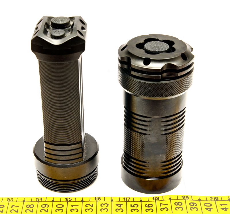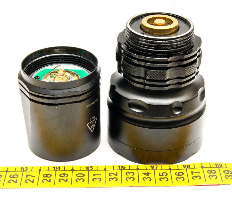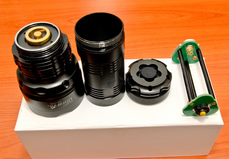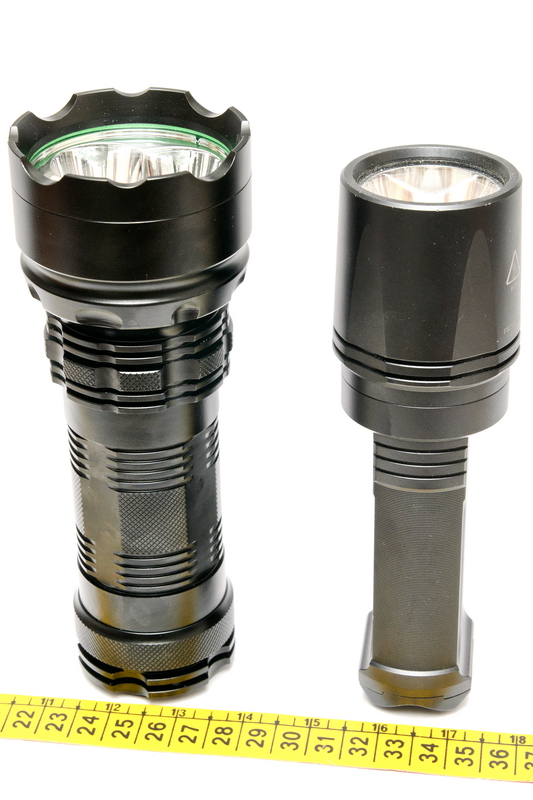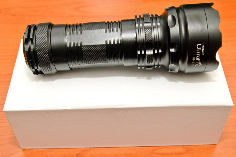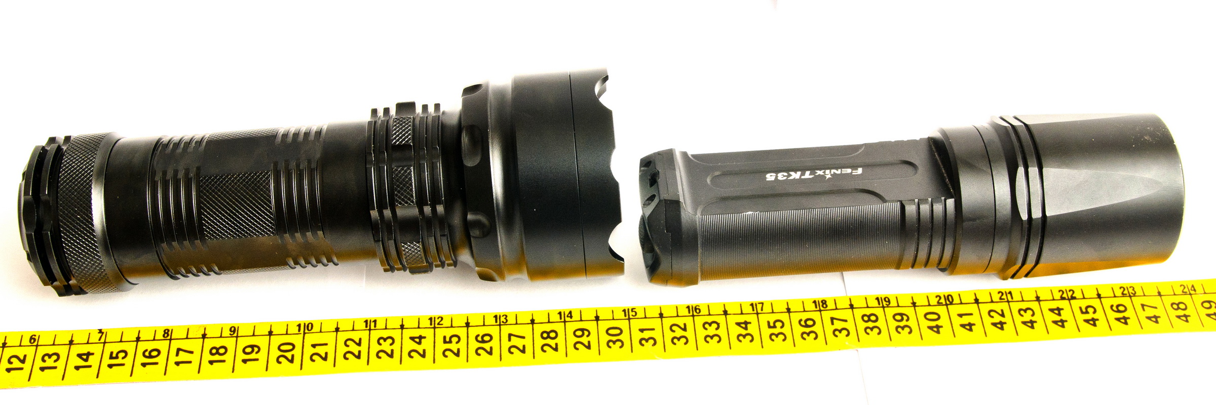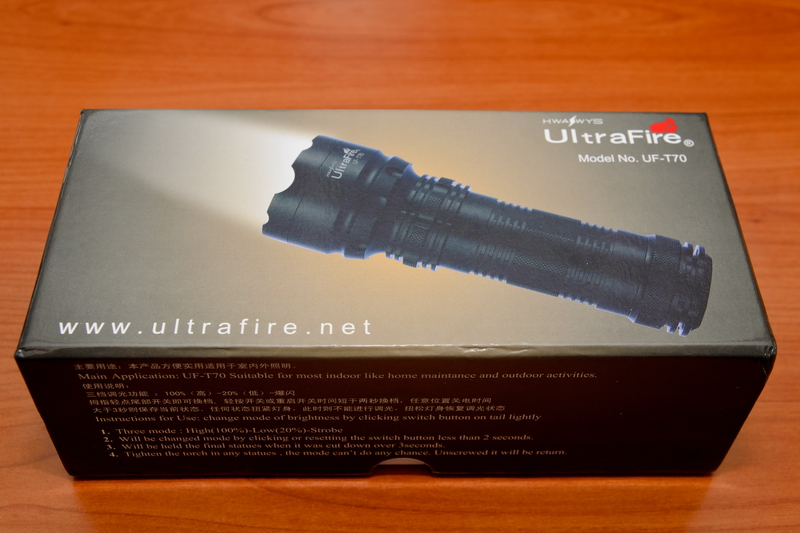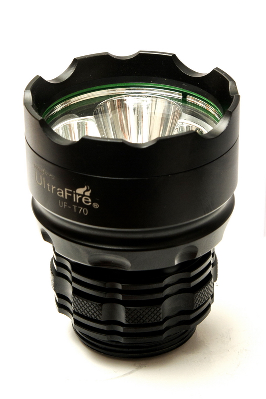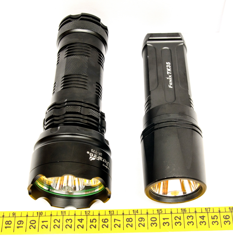 ...........НЕТ! не аптека, а велосипед. Именно в качестве велофары я использую свой фонарь. свой FENIX TK 35. Волей не волей, а придется сравнивать новенький ULTRAFIRE именно с FENIX. тем более, что диоды там стоят одинаковые, только в ULTRAFIRE их 3, а в FENIXe один. И так, предистория. Впечатлившись моим FENIX 35, его отменной и безукоризненной работой в качестве велофары (ну и конечно в отдельности от вела как фонаря), товарищ решил приобрести себе нечто подобное. Узнал что за диод стоит у меня и начал искать в инете. Нашел FENIX TK70. 3 диода по 800 люмен - НЕ ШУТКА. Но цена..... да и размеры его не устроили. И тут попадается ему ULTRAFIRE UF-T70. Смотрите ка, как названия похожи. Вроде в инете полным полно таких ULTRAFIRE UF-T70, а как дошло до дела, так обзоров нигде нет, на AMAZON нет, на DEALEXTREME тоже нет. И лишь на eBay был какой-то, не внушающий доверие продавец, причем один. И никто больше на тот момент не продавал данную модель ULTRAFIRE. Правда через 10 дней уже было больше предложений, но на момент покупки у товарища выбора не было никакого. Вообщем за фонарь отдал он 100$ и еще столько же за 3 комплекта аккумуляторов и зарядник. почему 3? потому что в ультрафаер нужно вставлять 3 li-ion батареи, а продаются по 2. если 2 шт., то мало, если 4 шт. то один лишний. пришлось брать 6 банок. И так, ненадежный продавец после фокусов с трек номером все таки дал его. Мы отследили посылку. Она дошла за 3 недели. Получили фонарь. фонарь упакован в коробку. Внутри полиуретановая прокладка в которую, как в колыбель, упакован фонарь. В комплекте был еще чехол. Но для обзора товарищ отдал мне только фонарь и коробку. чехол стандартный. Имеет крепление на ремень. Фонарь сидит в чехле прочно, крышка чехла закрывает голову фонаря полностью и фиксируется на заклепку. Фонарь раскручивается на 3 части и состоит из: 1. Головы 2. Корпуса - отсек для аккумуляторов. 3. Картриджа для аккумуляторов. 4. Крышки отсека аккумуляторов. теперь подробно о каждой из составляющих частей. Голова. В ней расположен драйвер и 3 светодиода Cree XM-L T6. Поскольку фонарь не мой, то разбирать голову и доставать драйвер я не стал. Могу сказать , что голова - самая тяжелая часть фонаря. Однако, в сборе с рукояткой и аккумуляторами она не перевешивает. Корпус - отсек для аккумуляторов. Ничего здесь примечательного нет. рукоятка как рукоятка. В руке лежит достаточно удобно. Однако после нее ТК35 кажется миниатюрненьким фонариком (по ощущениям как лежит в руке). Картридж для аккумуляторов. Вмещает в себя 3 аккумулятора типа 18650. В картридже расположена кнопка включения и выключения питания. так же эта кнопка служит для выбора режимов. Картридж достаточно прочный. Камазом, Белазом, Мазом и прочими тяжеловесами конечно не переезжал. Но если выронить из рук, то переживать не стоит - ничего не сломается. Крышка отсека аккумуляторов. Наверное, это самая интересная деталь для пользователя. Ведь именно она отвечает за управление функционалом фонаря. И управление это реализовано довольно таки хитро и, на мой взгляд, не очень удобно. Алгоритм следующий: 1.Включаем фонарь - жмем на кнопку. 2.Откручиваем крышку примерно на полоборота. Теперь кнопка работает как опция для выбора режимов. Их здесь 3. LOW, HIGH, STROBE. 3. Закручиваем крышку до упора. Выбранный режим зафиксировался и кнопка теперь работает как вкл/выкл. Что еще интересно. Кнопка не включает фонарь при полунажатии. Обязательно нужно довести до ще